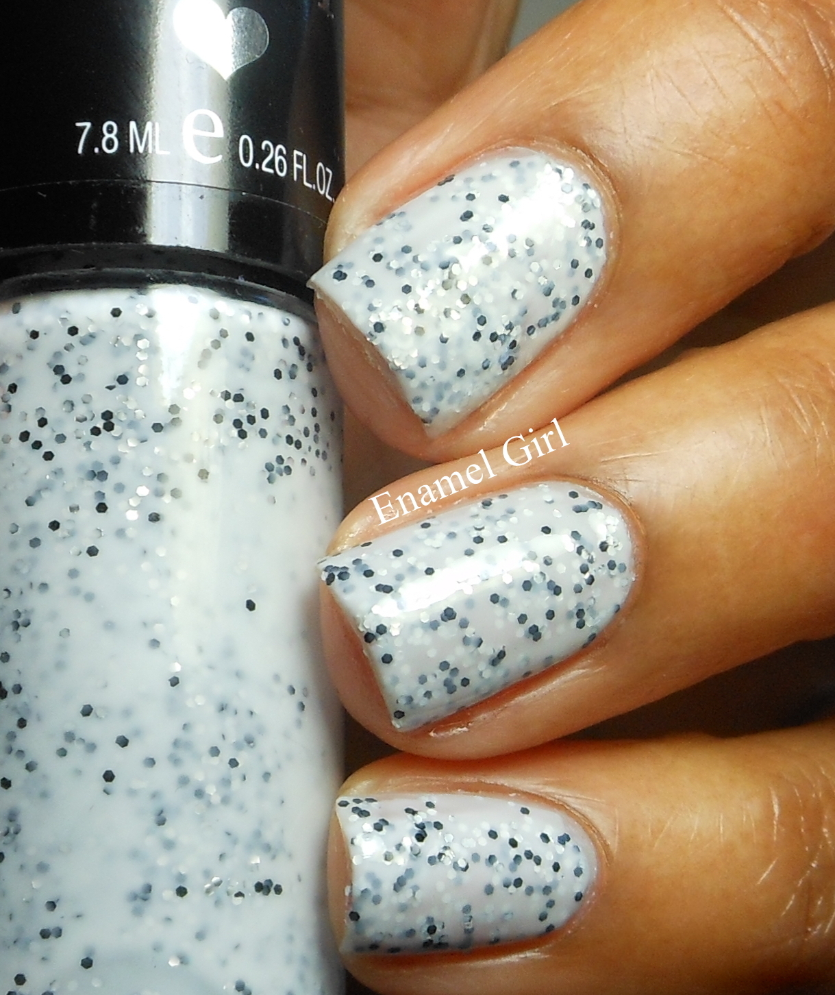 Sugar Rush - milky white base with black, white and silver mini glitter. Thicker formula than Sweet Tooth.
